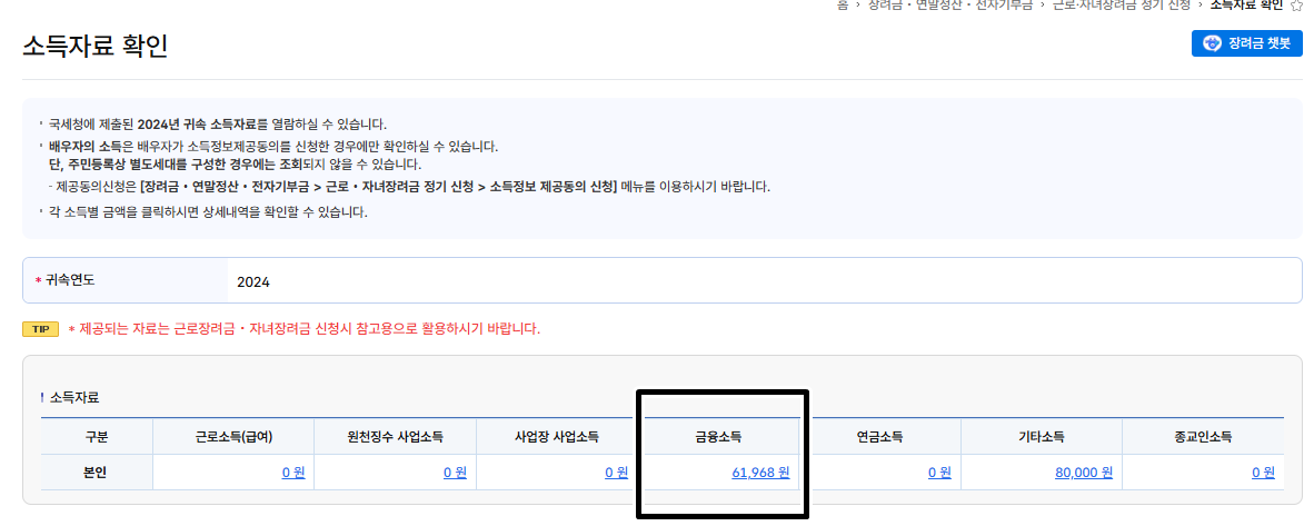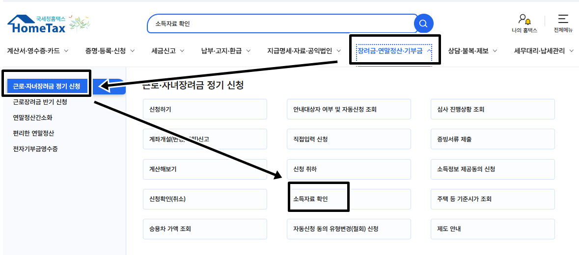 금융소득을 신고하려면 전체 금융기관의 금융소득을 확인해야 하기 때문에 이번에는 홈택스 장려금·연말정산·기부금 탭에서 근로·자녀장려금 정기신청 메뉴의 소득자료 확인으로 들어갑시다.