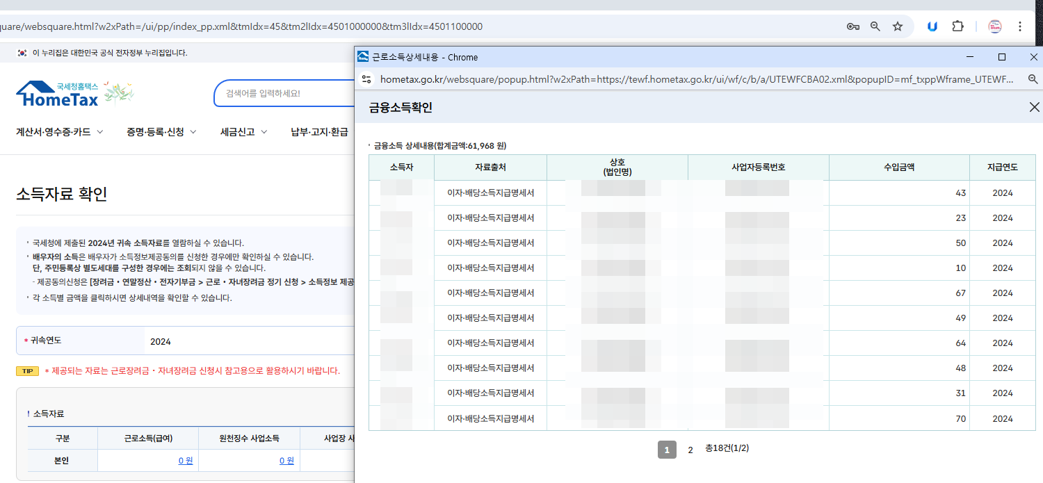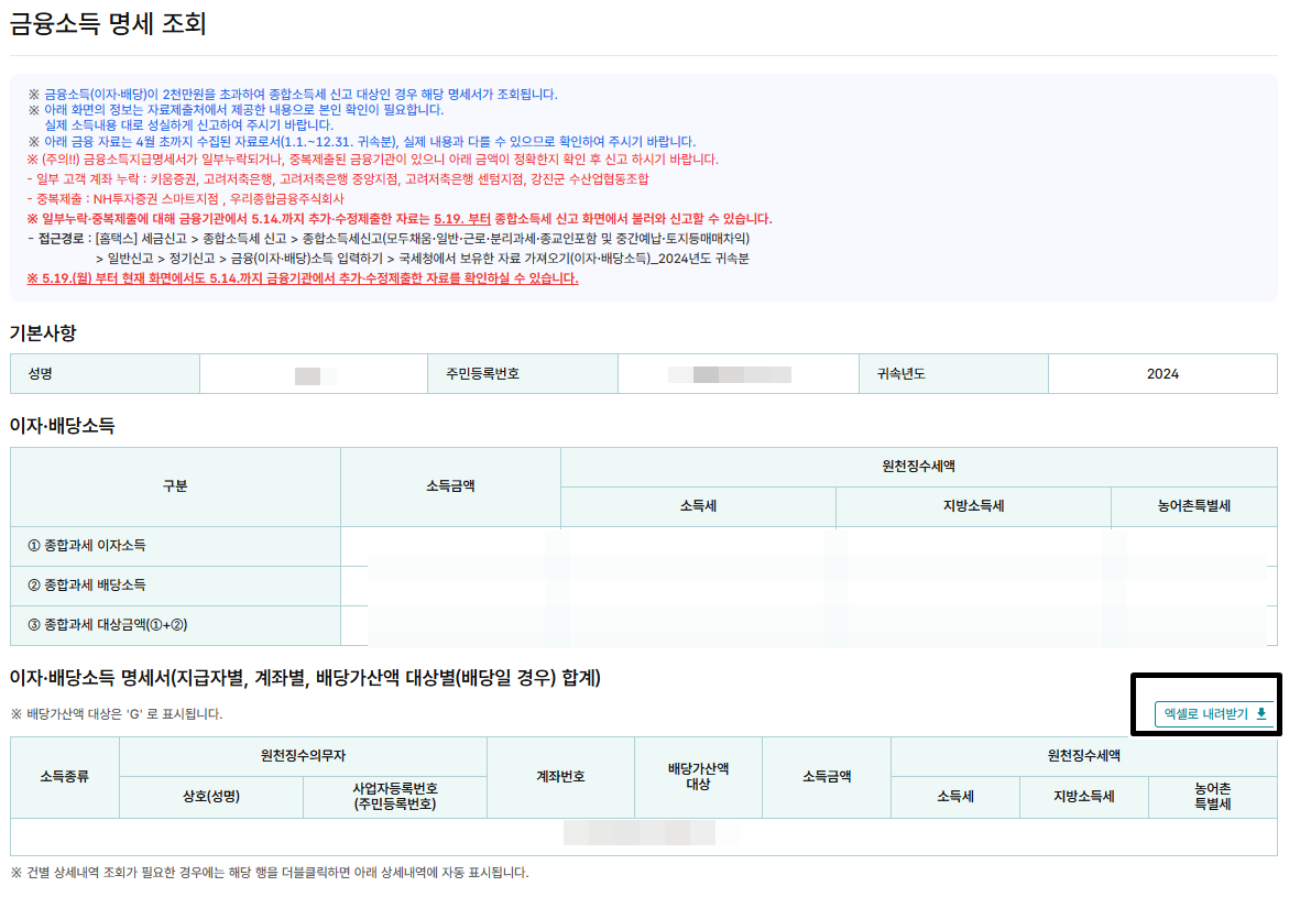 그런데 2024년 종합소득세 신고하는 과정에서 일부 금융기관의 소득이 누락되어 정상적인 금융소득이 조회되지 않고 있습니다.